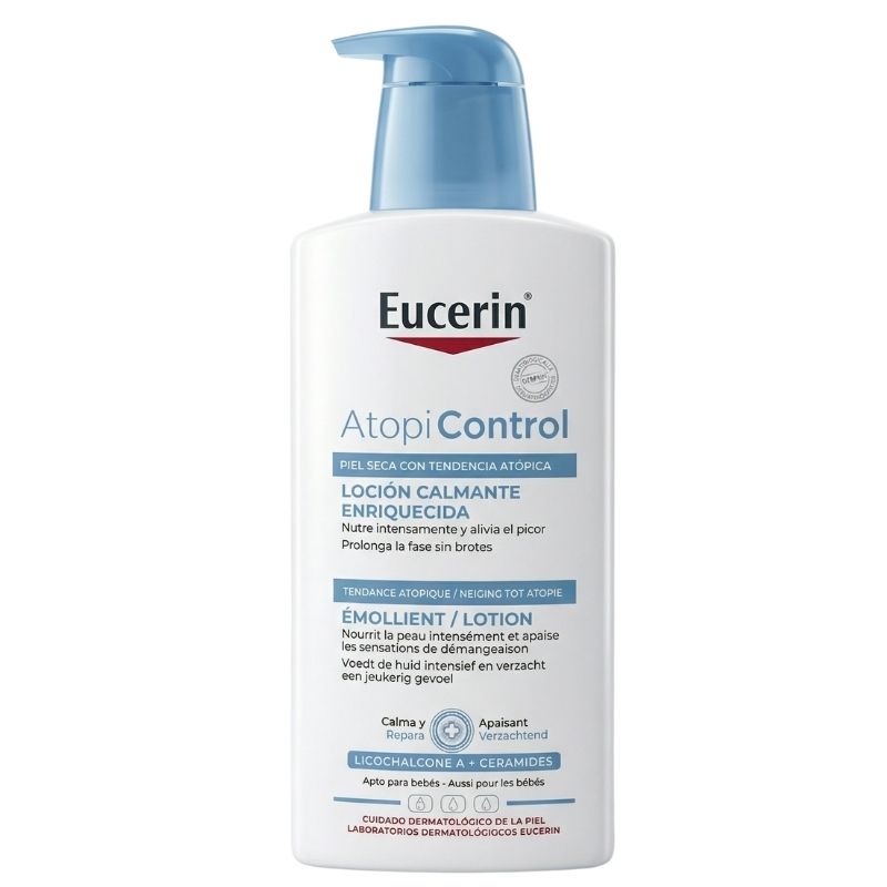 Eucerin AtopiControl Loción Corporal 400ml es una emulsión corporal de agua en aceite, de rápida absorción, diseñada para el cuidado diario de la piel atópica, irritada y seca. Su fórmula rica contiene un 12% de ácidos grasos Omega-6 (procedentes de aceite de onagra y semilla de uva) que regeneran la barrera cutánea, y Licochalcona A (extracto de raíz de regaliz) que calma la inflamación y el enrojecimiento. Hidrata profundamente, reduce la rugosidad y alivia el picor, ayudando a espaciar los brotes de dermatitis atópica. Es adecuada para adultos, niños y bebés a partir de los 3 meses. Sin fragancias, colorantes ni parabenos para minimizar el riesgo de irritación.