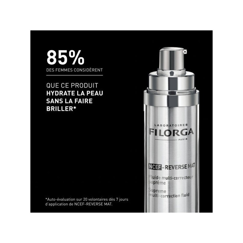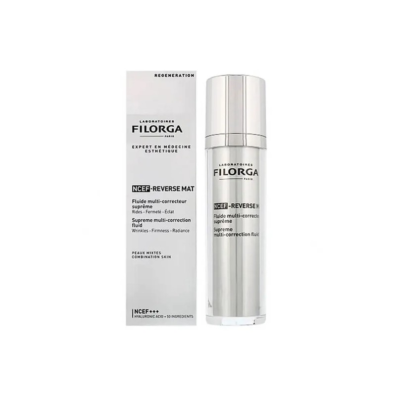 Filorga NCEF-Reverse Mat ofrece la misma potencia regeneradora que la versión en crema, pero en una textura fluida y ligera diseñada para pieles mixtas, grasas o que prefieren acabados mate. Contiene la misma concentración elevada de NCEF® (equivalente a una mesoinyección) para una renovación intensiva de la calidad de la piel. Además del ácido hialurónico, colágeno y vitaminas, esta versión incorpora un complejo perfeccionador (ácido oleanólico y extracto vegetal) que reduce el tamaño de los poros y controla el brillo excesivo. Proporciona una corrección global de arrugas, flacidez y falta de luminosidad, dejando la piel suave, mate y purificada.