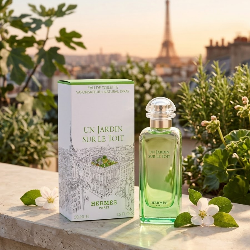 Un oasis urbano en tu piel con Hermès Un Jardin Sur Le Toit EDT 50ml. Fragancia unisex fresca y luminosa con notas de manzana, pera, rosa y hierba verde.