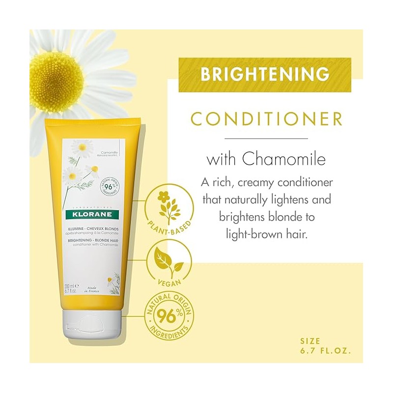 El Acondicionador Klorane a la Camomila es el paso esencial para sublimar el cabello rubio o castaño claro después del lavado. Su textura cremosa, fundente y rica en extracto de Camomila (Matricaria recutita L.), repara la fibra capilar, cierra las cutículas y desenreda el cabello al instante, dejándolo suave y ligero. El secreto de su eficacia reside en su alta concentración de apigenina, el pigmento natural de la camomila, que se fija en la superficie del cabello para iluminarlo con intensos reflejos dorados. Este bálsamo no solo embellece el color, sino que también nutre y restaura la suavidad del cabello seco o dañado, devolviéndole su flexibilidad y brillo natural. Es el aliado perfecto para cabellos rubios que tienden a enredarse o perder brillo. Su fórmula de alta tolerancia es adecuada para toda la familia (a partir de los 3 años) y para todo tipo de rubios: naturales, con mechas, teñidos o decolorados. Deja el cabello radiante, sedoso y lleno de luz.