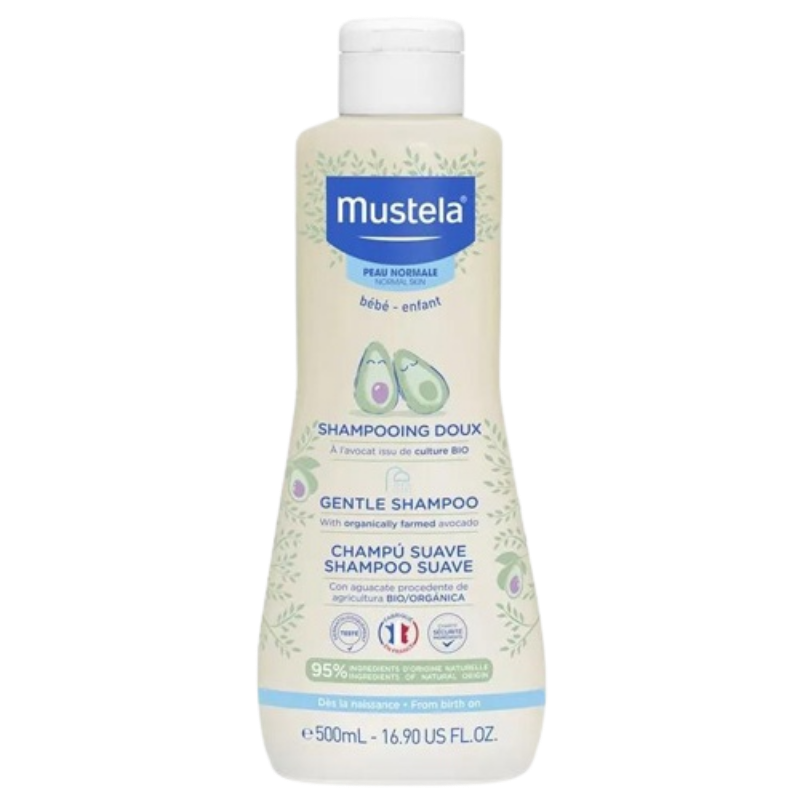 Cuidado capilar suave y sin lágrimas con Mustela Champú 500ml. Limpia, desenreda y protege el cabello de tu bebé con extracto de camomila y Perseose de Aguacate.