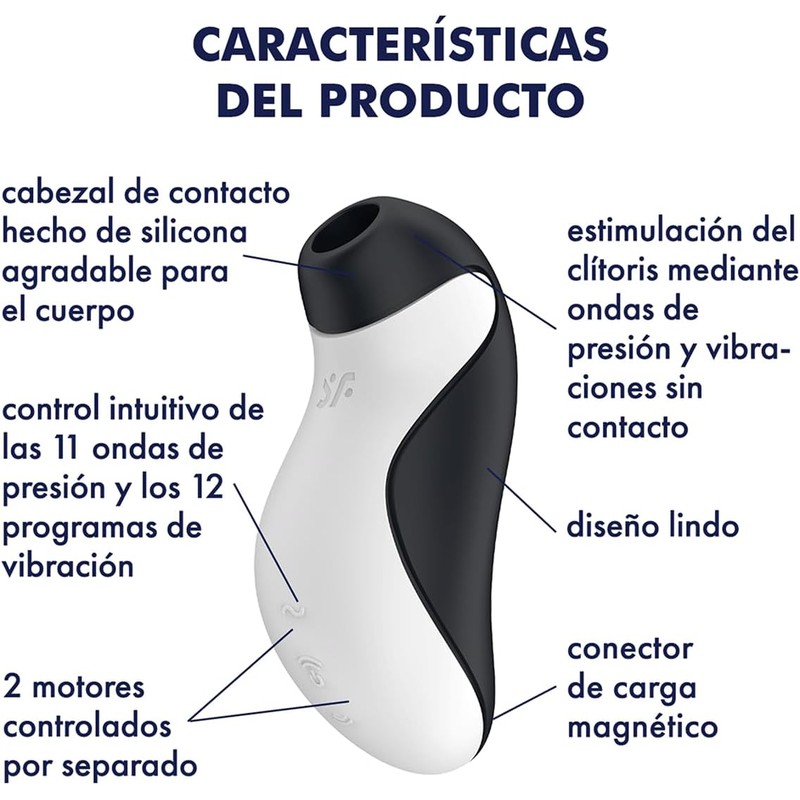 Satisfyer Orca es un vibrador elegante y versátil diseñado para la estimulación interna y externa. Su forma fluida y ligeramente curvada recuerda a la silueta de una orca, con una superficie amplia y plana ideal para masajear la vulva y una punta redondeada perfecta para la penetración vaginal y la estimulación del punto G. Fabricado en silicona médica voluminosa y suave, ofrece un tacto de lujo. Su motor potente distribuye vibraciones profundas a través de todo el cuerpo del juguete, permitiendo disfrutar de sensaciones tanto superficiales como internas. Cuenta con una amplia variedad de programas de vibración. Es impermeable (IPX7) y recargable, lo que lo hace apto para juegos bajo el agua y fácil de limpiar.
